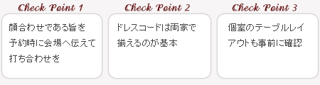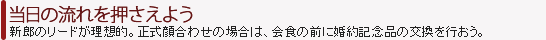 新婦宅へお招きする例もあるが、最近はホテルの顔合わせプランを利用したり、個室のある落ち着いたお店を選ぶのが一般的。接客の質も注意したい。また、両家からのアクセスを考えるのもポイント。予約時に顔合わせである旨を伝えて部屋の確保を。