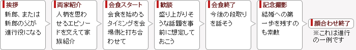 ふたりが両家を招いて席を設ける場合は、新郎が司会進行役をするのもOK。正式な顔合わせをするなら、会食までは新郎の父親に任せるとフォーマルな流れになる。顔合わせや食事会は正式な進行が決まってないため、事前にふたりで段取りを決めておくことが大切。会食の前に、婚約指輪を渡したり、婚姻届への署名をお願いするなどの、ちょっとしたセレモニーを盛り込むと、メリハリの効いた流れができあがる。