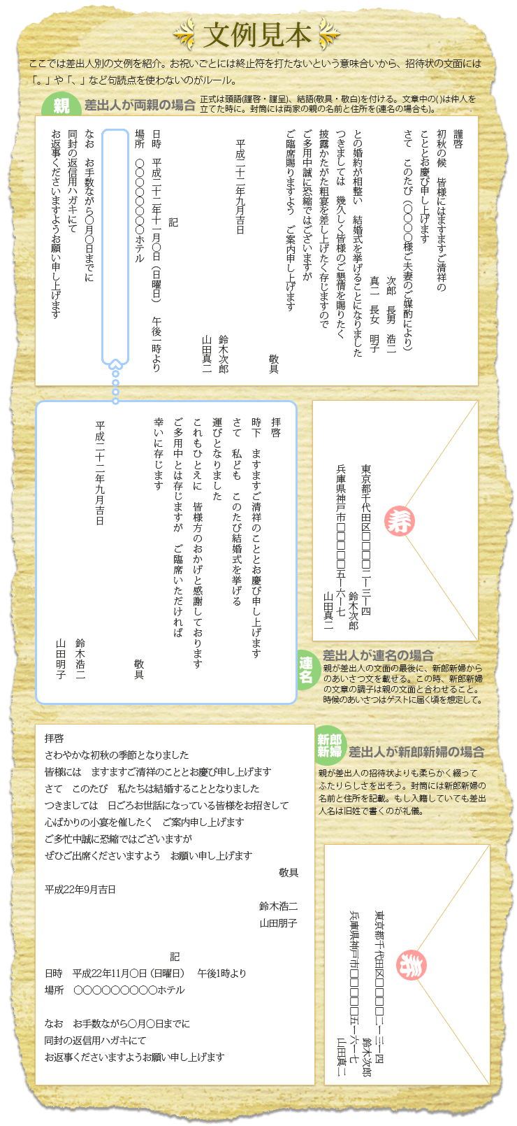 親が主催でもゲストの顔ぶれが友人中心だったり、親族ゲストと友人ゲストの割合が同じだったり、親と離れて暮らしている場合などは親子の連名で出してもいい。親にするか、新郎新婦にするか迷ったら差出人を連名にするというのも手。