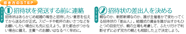 ことが大切。遅くとも式の2ヵ月前には発送できるよう、「招き方のSTEP」を参考に準備を始めよう。