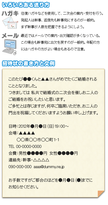 最近ではメールでの案内・出欠確認が多くなっている。この場合も幹事宛に出欠を戻すのが一般的。年配の方にはハガキの方がよい場合もあるので注意。