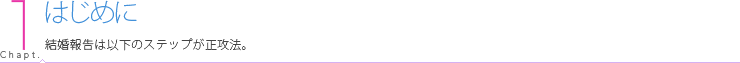 結婚報告の流れは上の手順が基本。まずは双方の両親に結婚の許諾をもらい、それから職場の上司に報告。その後、同僚や友人、親族たちへとつなぐ。結婚報告はふたりの新しい門出を周囲に気持ちよく祝福してもらうためにも大事な部分。おろそかにすると今後の関係性にも影響しやすいので、一歩一歩マナーにのっとって進めよう。ここでの大人の対応が、後の結婚式や新生活を輝くものにするはず。