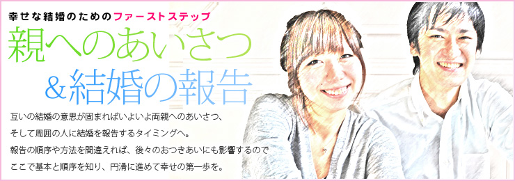 まず最初に行うべきは、親へのあいさつ。結婚を許してもらうのが目的なので、いくら家同士が気心の知れた間柄でもケジメとしてきちんと行うのが礼儀。詳しくは次頁からの「親へのあいさつ」もチェックして。