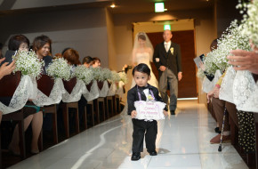 挙式は、おふたりの可愛い可愛い長男くんが先導しご入場、新婦様妹様が手作りのsomethingblueにちなんだ青いバラで彩ったリングピローで指輪交換を行いました。