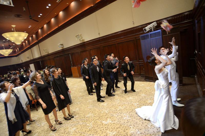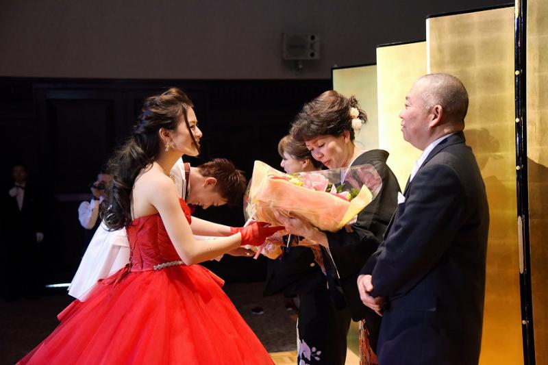 千夏様)私は、披露宴最後の花束贈呈のシーンですね。披露宴の間、私たち二人はとにかく楽しくてずっと笑顔だったんですが、親たちの涙を見て、思わずもらい泣きしてしまいました。新郎もこの花束贈呈のシーンは、ビールサーブの場面と同じくらい印象的だったそうです。それにその後の自分の謝辞も。緊張していたけれど、ゲストやスタッフの方々へ、そして親にも「ありがとう」を伝えられて、上手くいった!と言ってます。