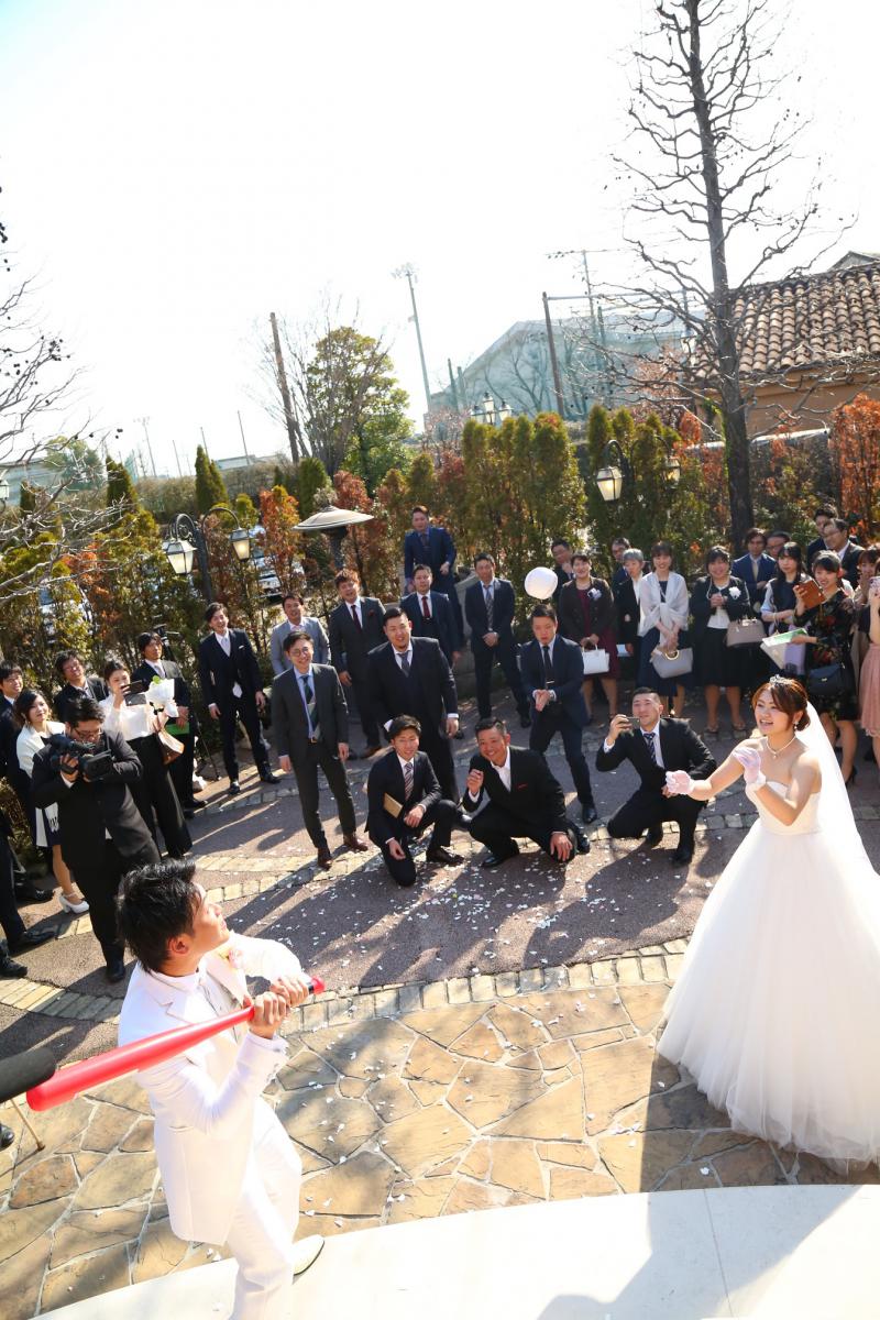 アフターセレモニーで新婦のブーケトス後は新郎からのバッティングトス!