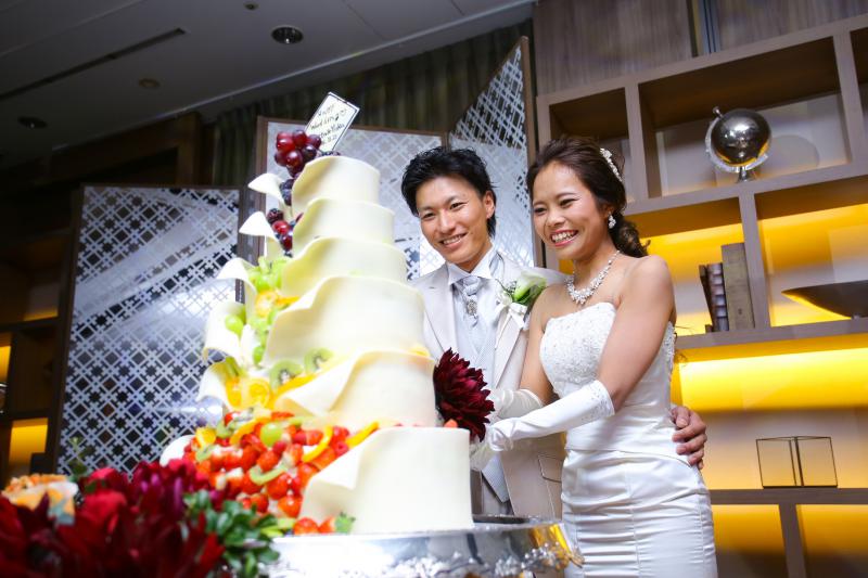 フルーツたっぷりのウェディングケーキに入刀後はファーストバイトの演出を!