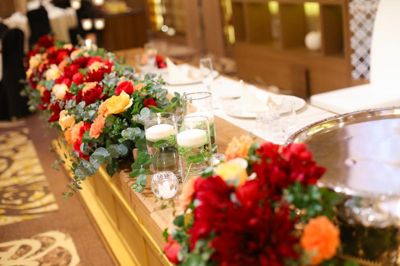 披露宴会場の装花は、新婦母が好きな花をたくさん取り入れ、華やかな雰囲気に