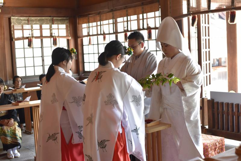挙式は神社式を希望し、挙式までの時間庭園で写真を撮り、親族を中心に厳かな中執り行われました。