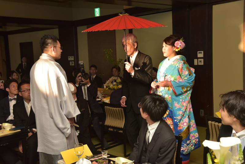 披露宴がスタートすると、優さんはお父さまと一緒に鮮やかなブルーの色打掛姿で登場。