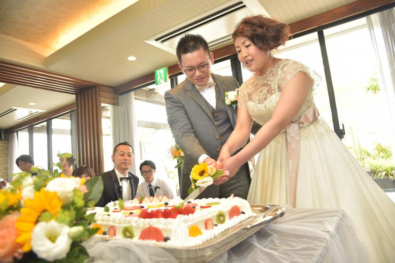 洋装へお色直し後、ケーキ入刀し、雄志さんへたっぷりのケーキでファーストバイトを。