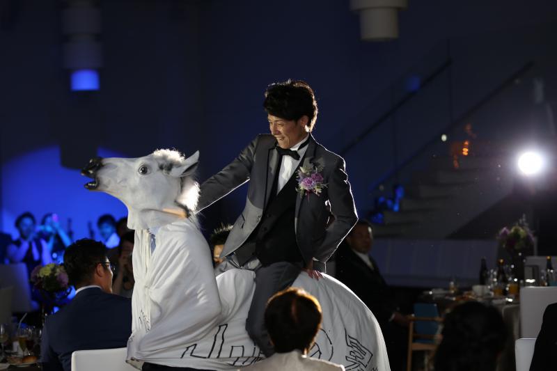 お色直し後の入場では、式場スタッフさんと相談し、友人に協力してもらい馬に乗って入場!!