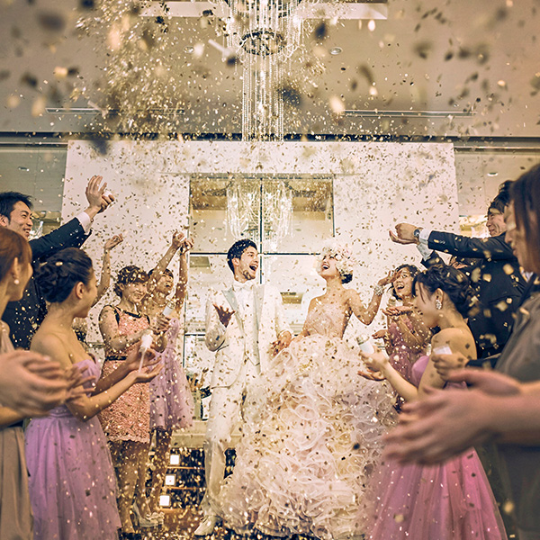 シャンデリアの光を浴びたミラーウォールの隠し扉が、花嫁の憧れのサプライズ入場を演出!