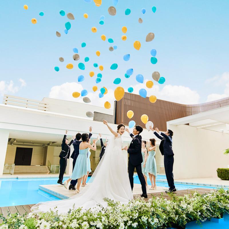 音楽堂での挙式後は、青い空に向けてバルーンリリースを。