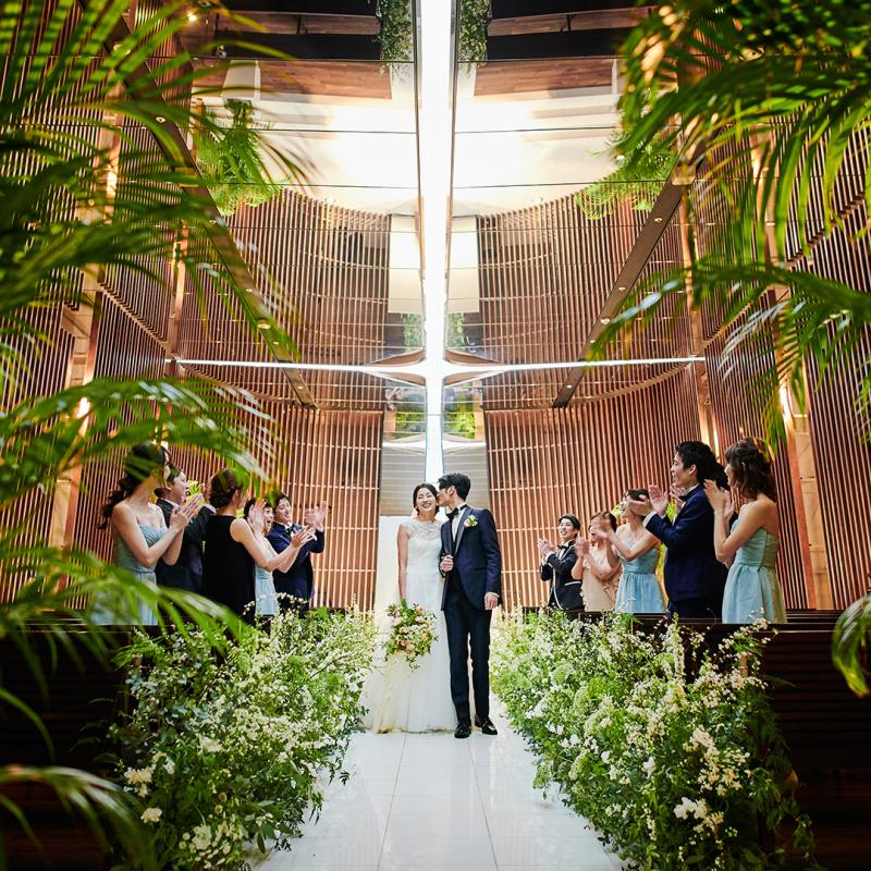 厳かな空間の中にも開放感を感じながらの式は他にない印象に。友人にも見届けてもらえる。