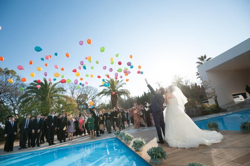 ラグーンでのバルーンリリース☆晴天に色とりどりのバルーンが映えます