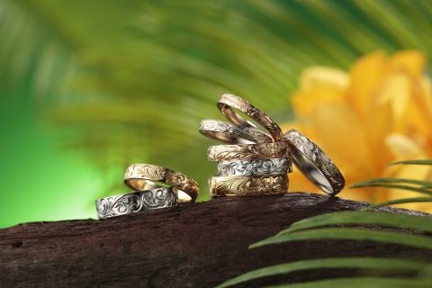 鍛造造りで抜群の強度をもつリングに、熟練職人が丹念にハワイアン彫り模様を施した